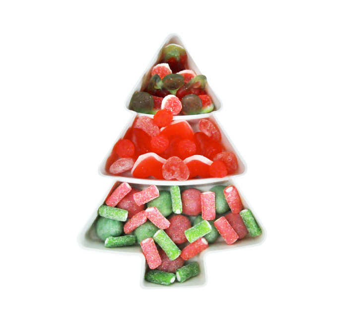 Bandeja de plástico con forma de abeto, repleta de chucherías en tonos rojos, verdes y blancos. Encontrarás desde las más ácidas bolas con sabor a arándano o sandía, hasta los regalices ácidos de fresa o manzana, pasando por los suaves y esponjosos corazones de gelatina de fresa y vainilla o bien las riquísimas cerezas, que tantos recuerdos infantiles nos traerán.