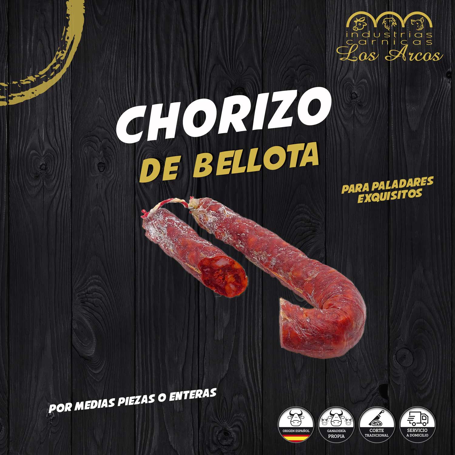 Chorizo de bellota por medias piezas o enteras a 17,99€/kg. Se añadirá al pedido 1 kg por unidad seleccionada.