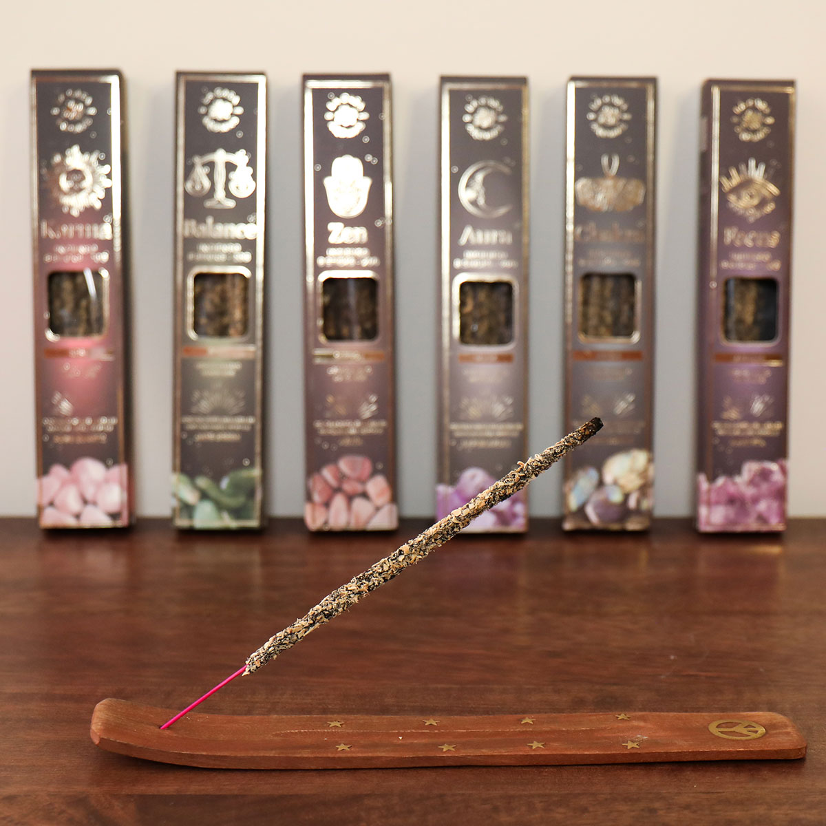Sumérgete en un viaje sensorial a través de la magia de los astros con nuestra nueva colección de Inciensos Mystic. Inspirada en la conexión entre la tierra y el cosmos, cada varilla desprende una fragancia única que eleva la energía de tus prácticas de yoga, meditación o momentos de relajación. Cada aroma ha sido seleccionado para conectar cuerpo, mente y alma. La colección se presenta en un diseño elegante y místico que decora tu espacio. Además, cada paquete incluye piedras espirituales que crean un ambiente de paz y armonía.