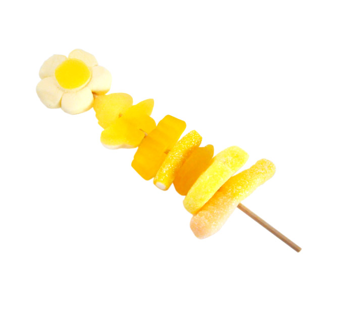 ¿Buscas un detalle llamativo y que capte la atención de quien lo reciba? Esta brocheta en tonos amarillos, encantará tanto por su variedad de sabores como por lo bonita que es.