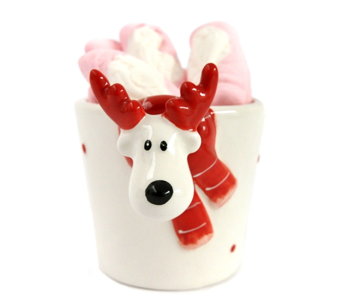 Taza mediana decorada con simpático reno que viene rellena de espumas de fresa con forma de Papá Noel. Un recuerdo gracioso que nunca olvidarán.